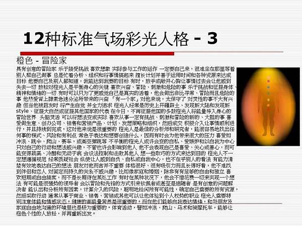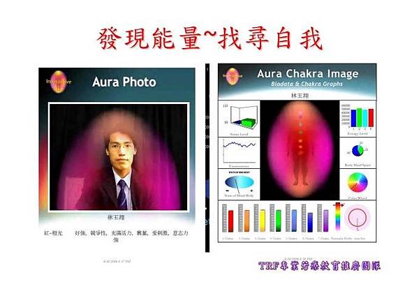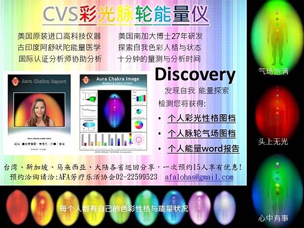 在量測的過程中每個人可以得到自己的專屬1.個人彩光性格圖檔2.個人脈輪氣場圖檔3.個人能量word報告.透過個人圖檔可以瞭解到自己的能量氣場大小、脈輪狀況、個人的彩光性格、需要平衡的色彩建議…等。
