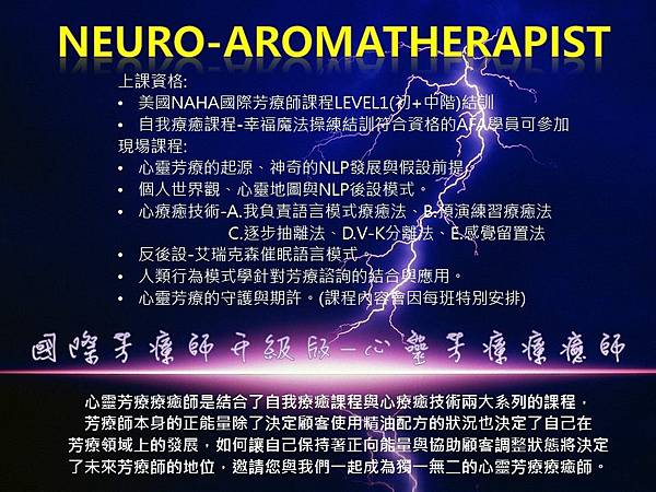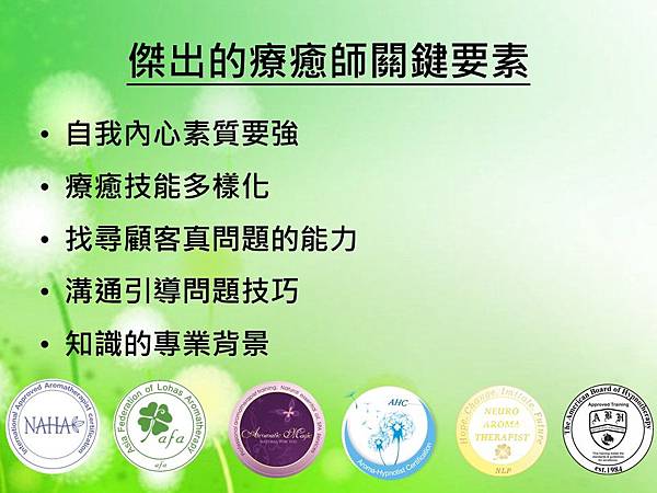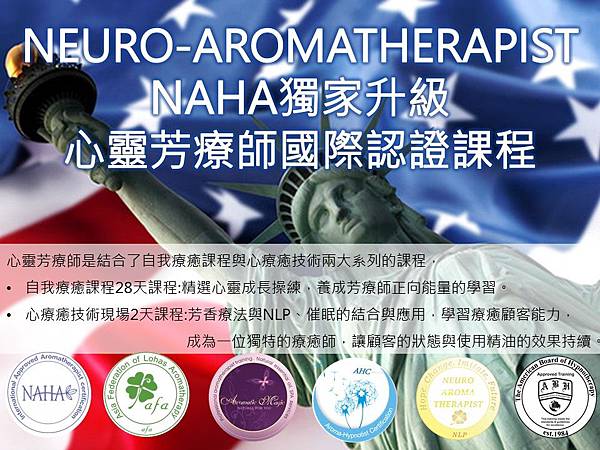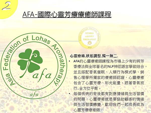 心靈芳療療癒師是AFA獨有的認證課程,課程結合了芳香療法的專業知識、香氣催眠的療癒、人類行為模式學、銷售心理學與全球最知名的NLP成功學…等所組合成的精華課程。