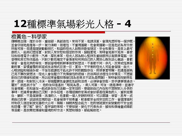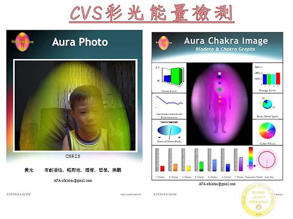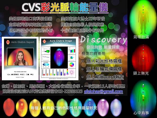 在量測的過程中每個人可以得到自己的專屬1.個人彩光性格圖檔2.個人脈輪氣場圖檔3.個人能量word報告.透過個人圖檔可以瞭解到自己的能量氣場大小、脈輪狀況、個人的彩光性格、需要平衡的色彩建議…等。