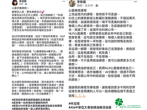 很多人很好奇芳療師結合了療癒師那會是多麼神奇的組合?沒有錯~我們已經見證了很多學員見證,一些原本精油處理不了的問題但藉由療癒師的協助,很神奇的是顧客就這樣療癒了。