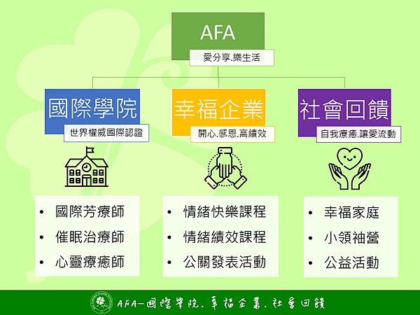 AFA心靈療癒師課程分為自我療癒與療癒他人技術課程,在自我療癒課程我們有一個月的線上操練,操練著幸福魔法,幸福不是一種天賦,是一種心的選擇能力,絕大多數的人因為看事物的選擇進入了誤區,而形成了錯誤的情緒,最後變成一種連自己都不喜歡的人格,在這一個月的線上操練我們從自己與自己的關係、與家人的關係、與金錢的關係、甚至於傷害自己的人關係開始改變起,很神奇只要過了這一個月大家彷彿重生了…到目前為止沒有錯這一個月也是最艱難的,太多的理由阻礙了我們自己完成一個月的課程,所以這也是為何需要我們教練的因素,相信我~一個月後你將重生!!